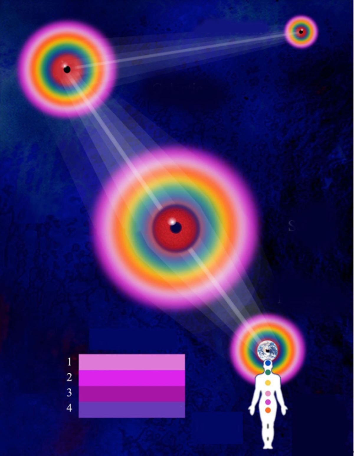 The step beyond that is what in the East is called the ‘bliss body’—this is a body of divine darkness and refers to the stage when the etheric body becomes imbued with the darkness or Life of the monad which is in reality an expression of the Shamballic force. The alignment with the galactic centre is an outer representation of the alignment between the lesser system and the greater.